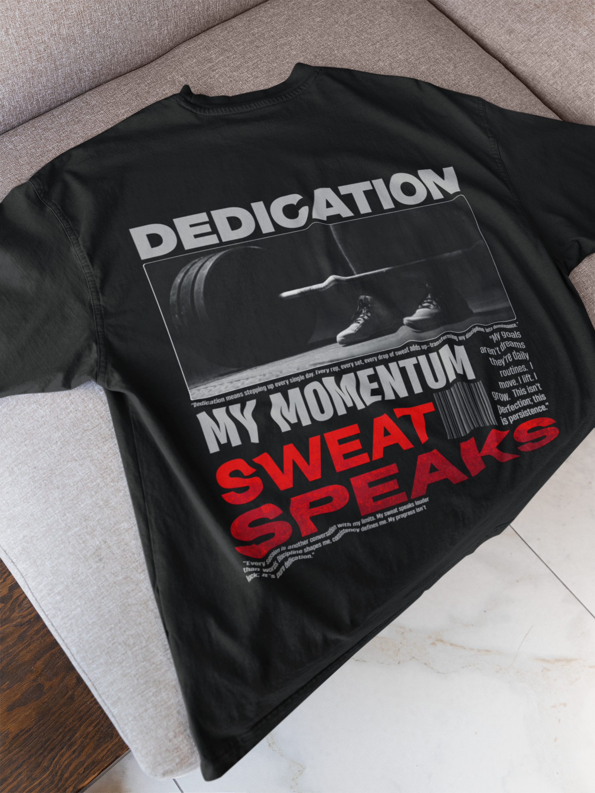 The “DEDICATION / MY MOMENTUM / SWEAT SPEAKS” message gives me that extra push on tough days. The print quality is excellent and doesn’t fade after multiple washes.